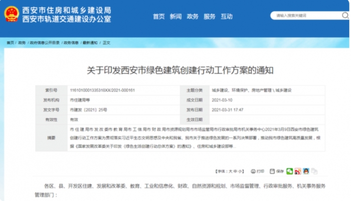 日前,西安市住建局發(fā)布關(guān)于印發(fā)西安市綠色建筑創(chuàng)建行動工作方案的通知。