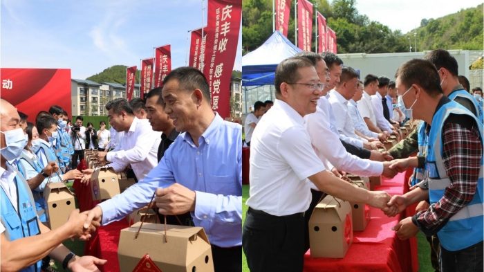 慰問(wèn)活動(dòng)現(xiàn)場(chǎng),與會(huì)領(lǐng)導(dǎo)為農(nóng)民工朋友們發(fā)放慰問(wèn)品,并隨后觀(guān)看了“慶豐收、感黨恩”慰問(wèn)演出。