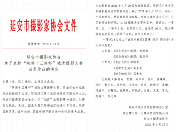 9月29日,由延安市城區(qū)改造指揮部辦公室聯(lián)合陜西建工第十三建設集團有限公司主辦、延安市攝影家協(xié)會承辦的“陜建十三建杯”城改攝影比賽頒獎儀式暨獲獎作品展在延安市小東門廣場圣地影像畫廊圓滿舉行。