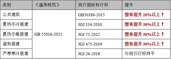 《通用規(guī)范》提高了居住建筑、公共建筑的熱工性能限值要求,與大部分地區(qū)現行節(jié)能標準不同,平均設計能耗水平在現行節(jié)能設計國家標準和行業(yè)標準的基礎上分別降低 30%和 20%。